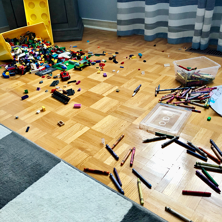 STEP 16: Get the mess off of the floor and organized into the bins that fit into the shelving units.
