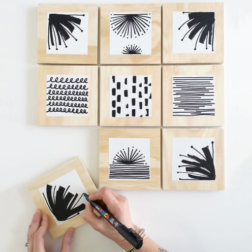 - Start with 9 wood squares at 5in x 5in. You can have the wood cut at your local hardware store if needed.